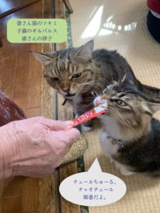 写真は、律子ばあちゃんからチャオチュールをもらう子猫のギルバルスと婆さん猫のツキミ。