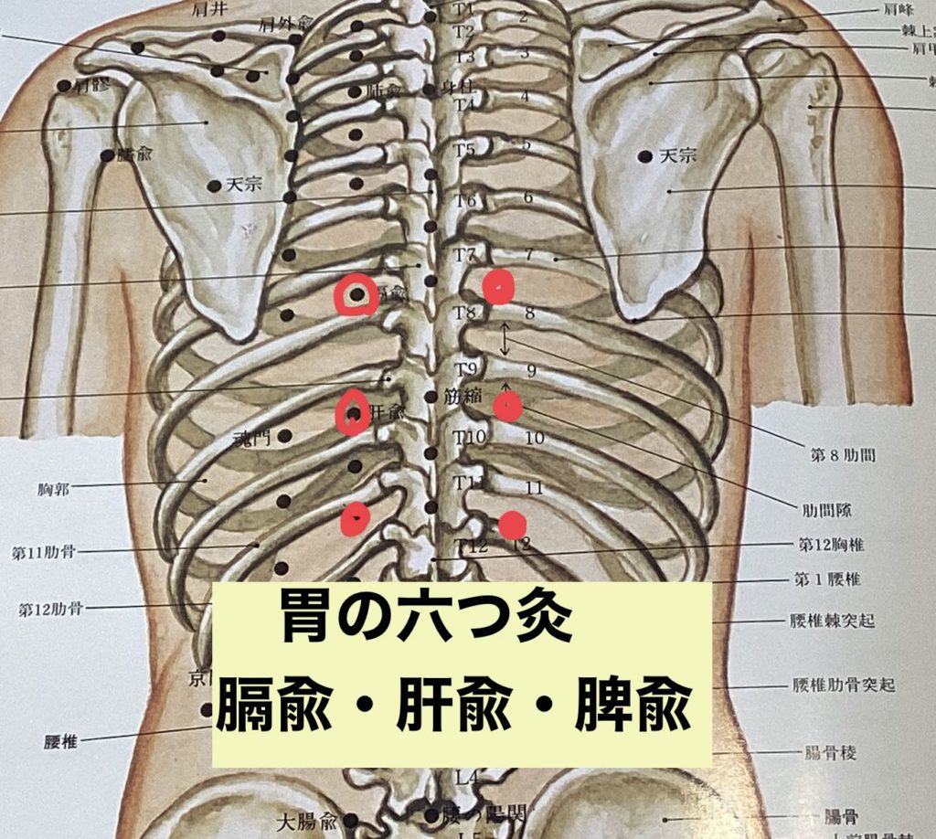 膈兪(BL17)という、分け隔て類地、肝兪(BL18)というストレス対応、脾兪という胃腸のツボ。